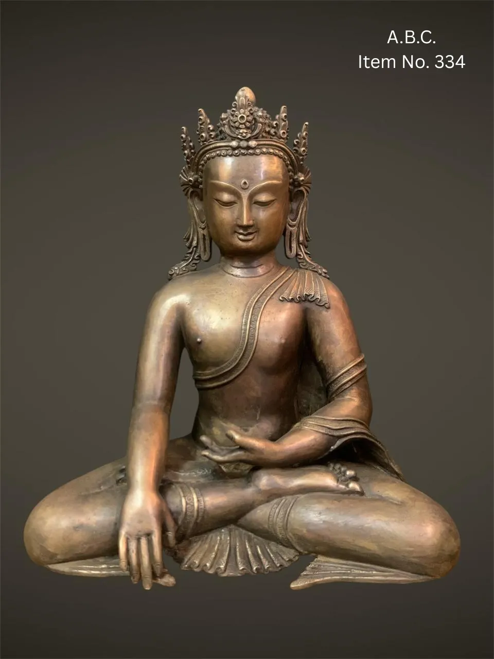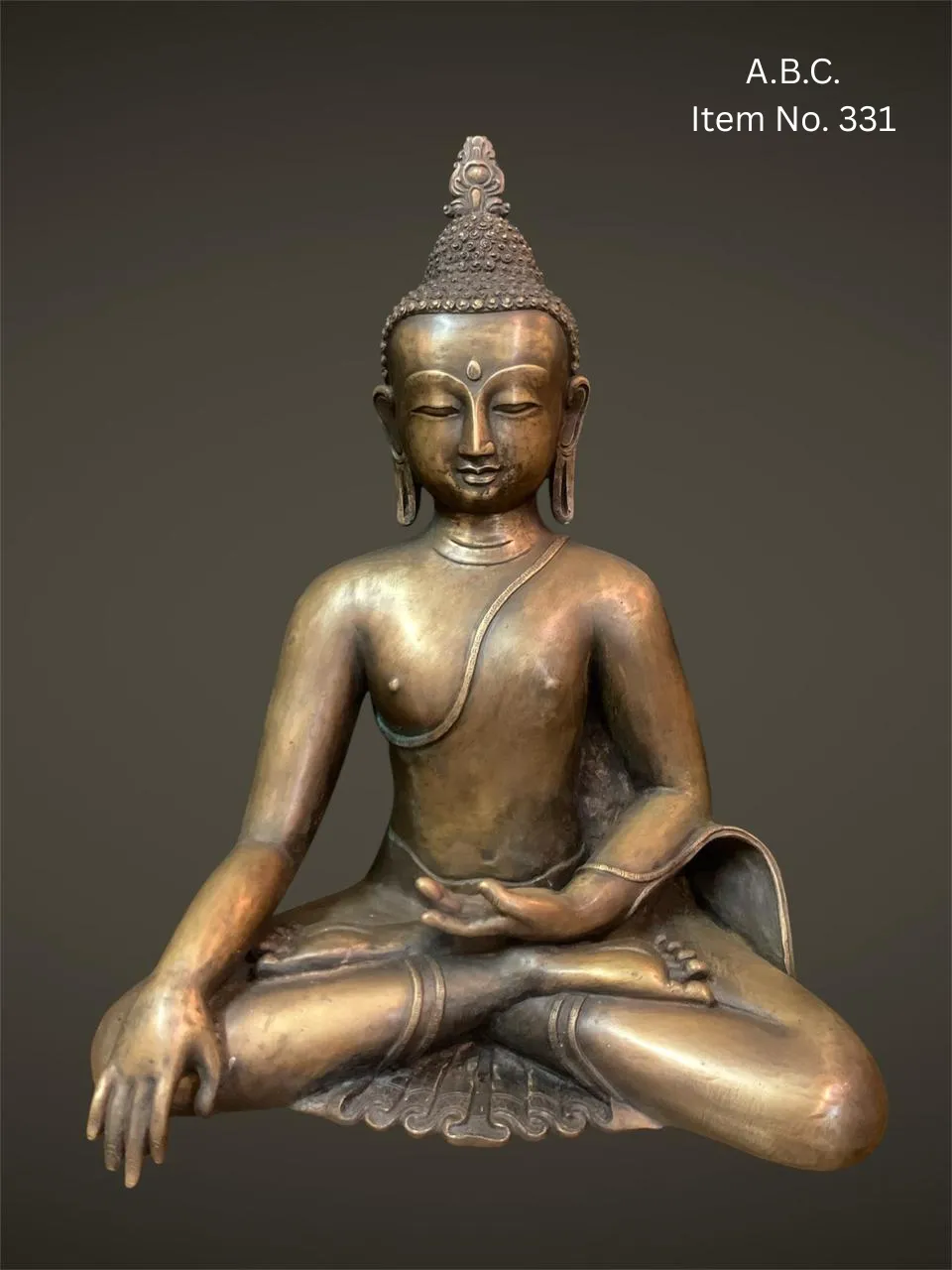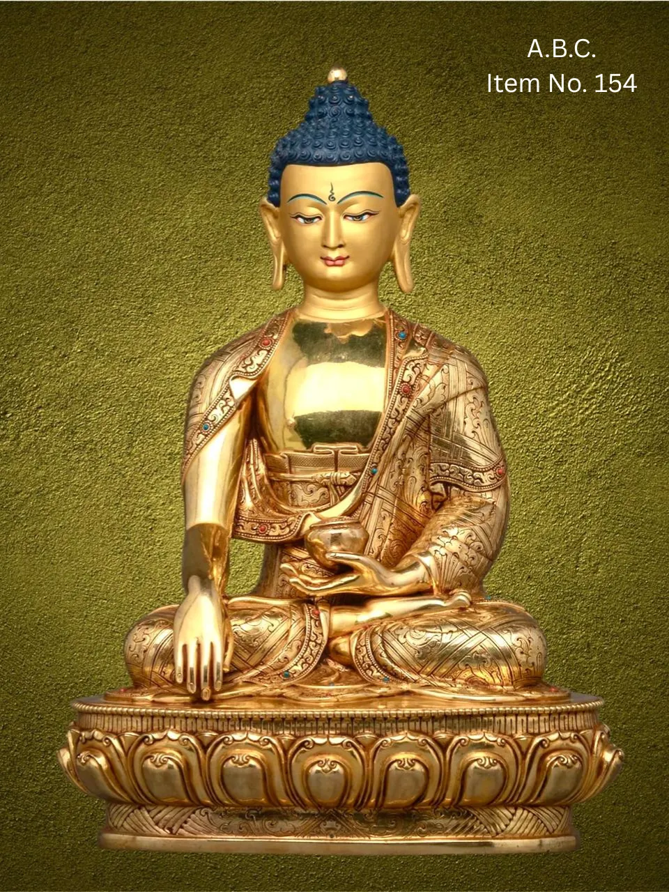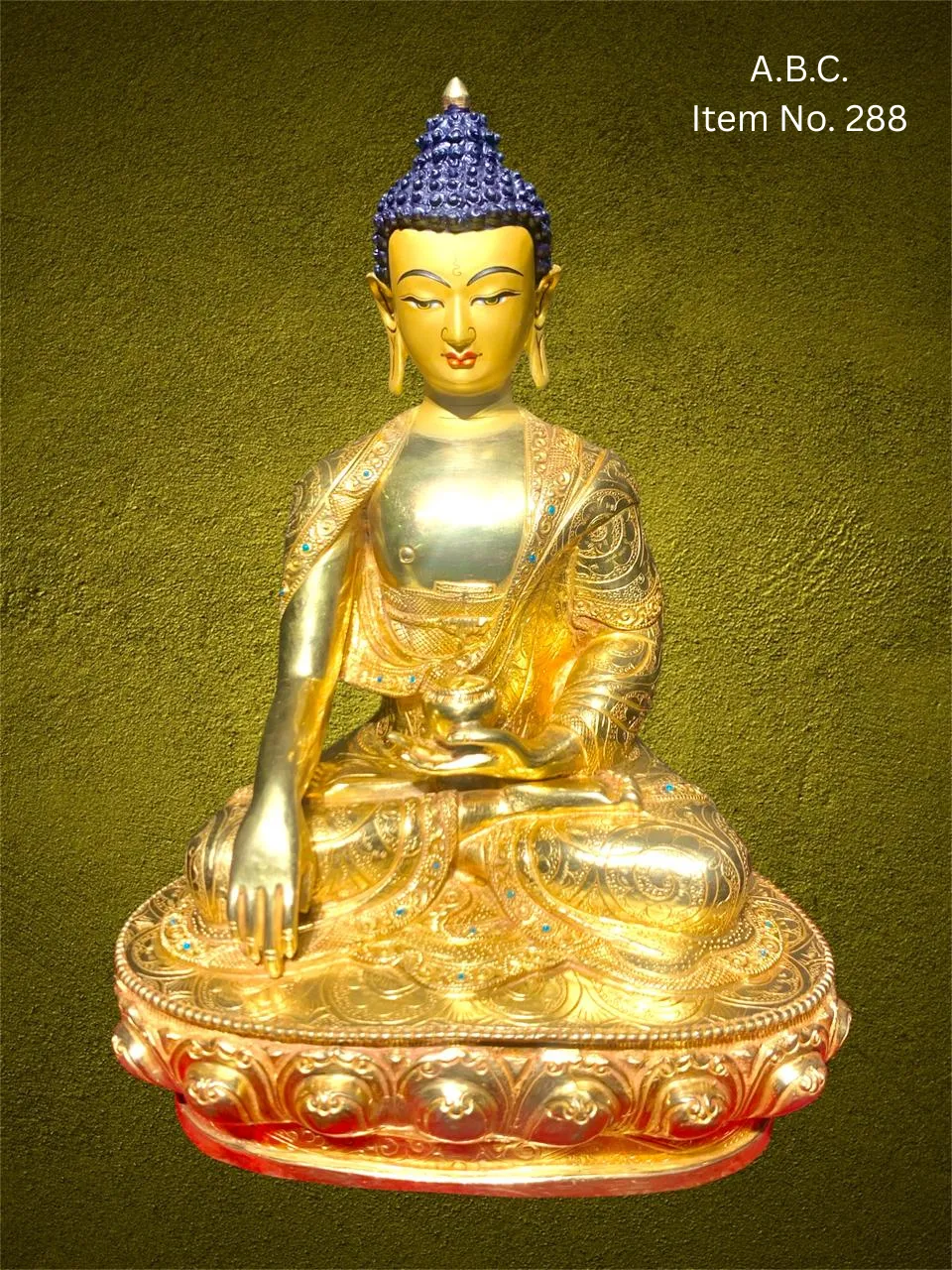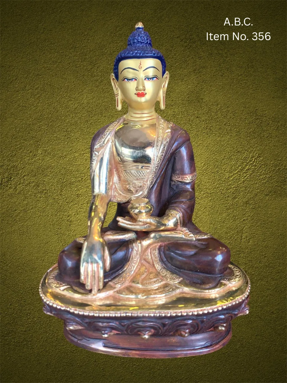 – Medicine Buddha (Bhaisajyaguru) in seated posture, right hand in earth-touching mudra, left hand holding a medicine bowl. Often with blue or deep bronze tones.