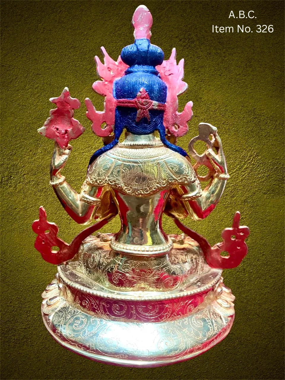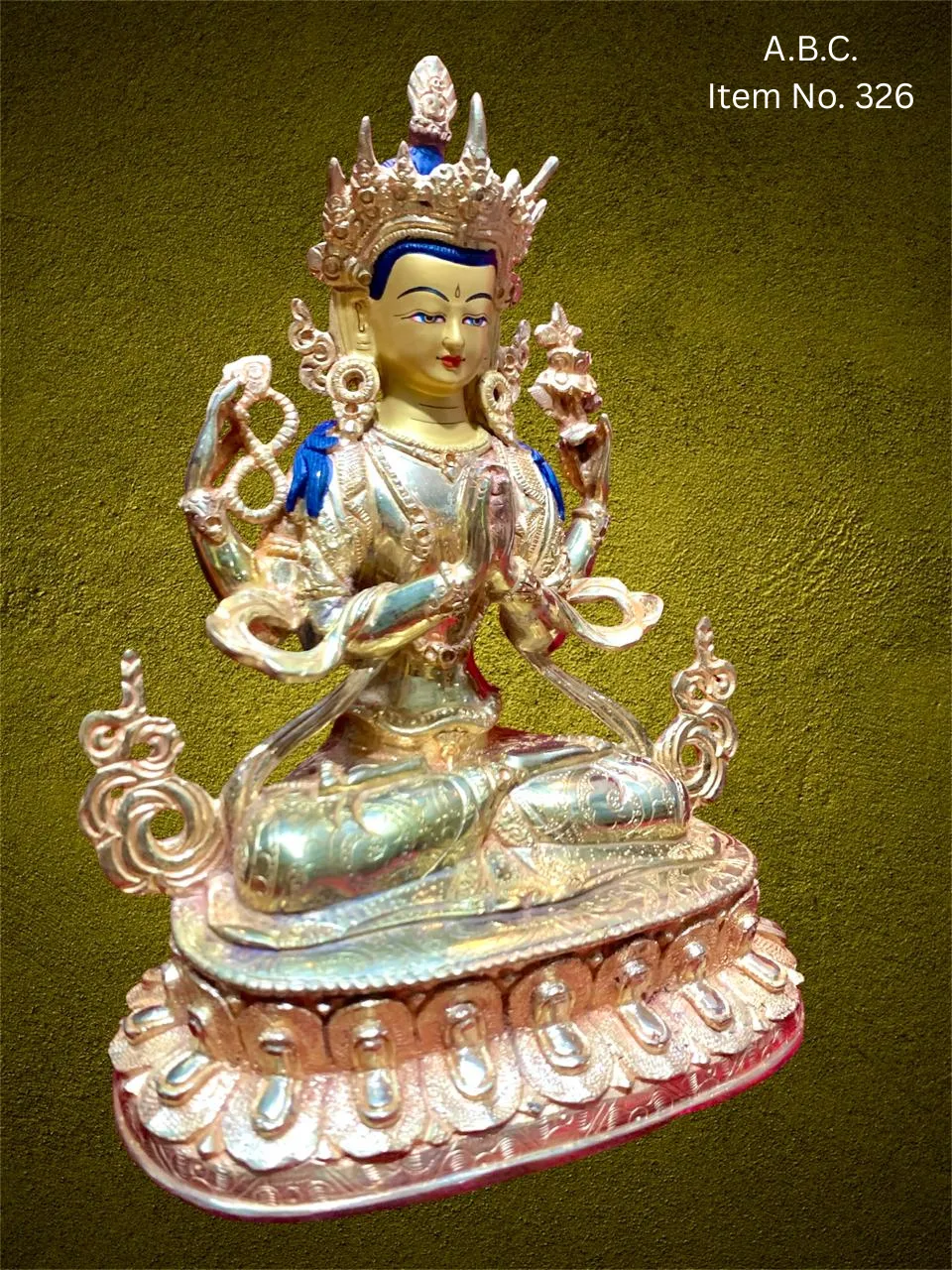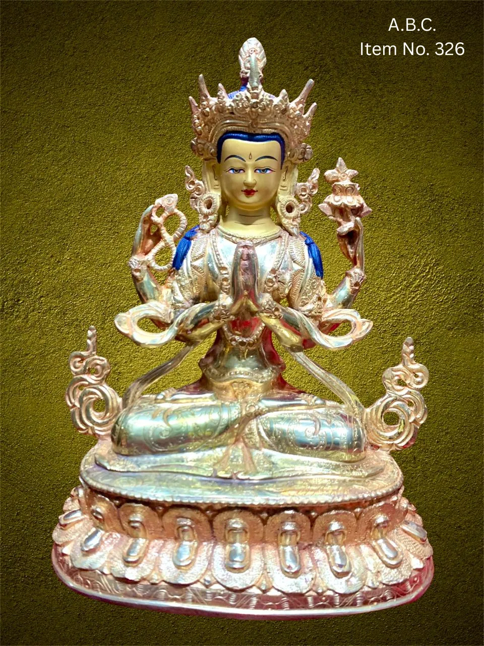 – Chenrezig (Avalokiteshvara) Four-armed figure, holding a lotus, mala, and in prayerful posture.