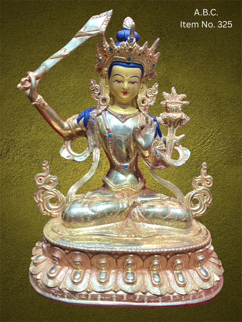 – Manjushree seated with flaming sword raised in right hand, left hand holding scripture on a lotus.