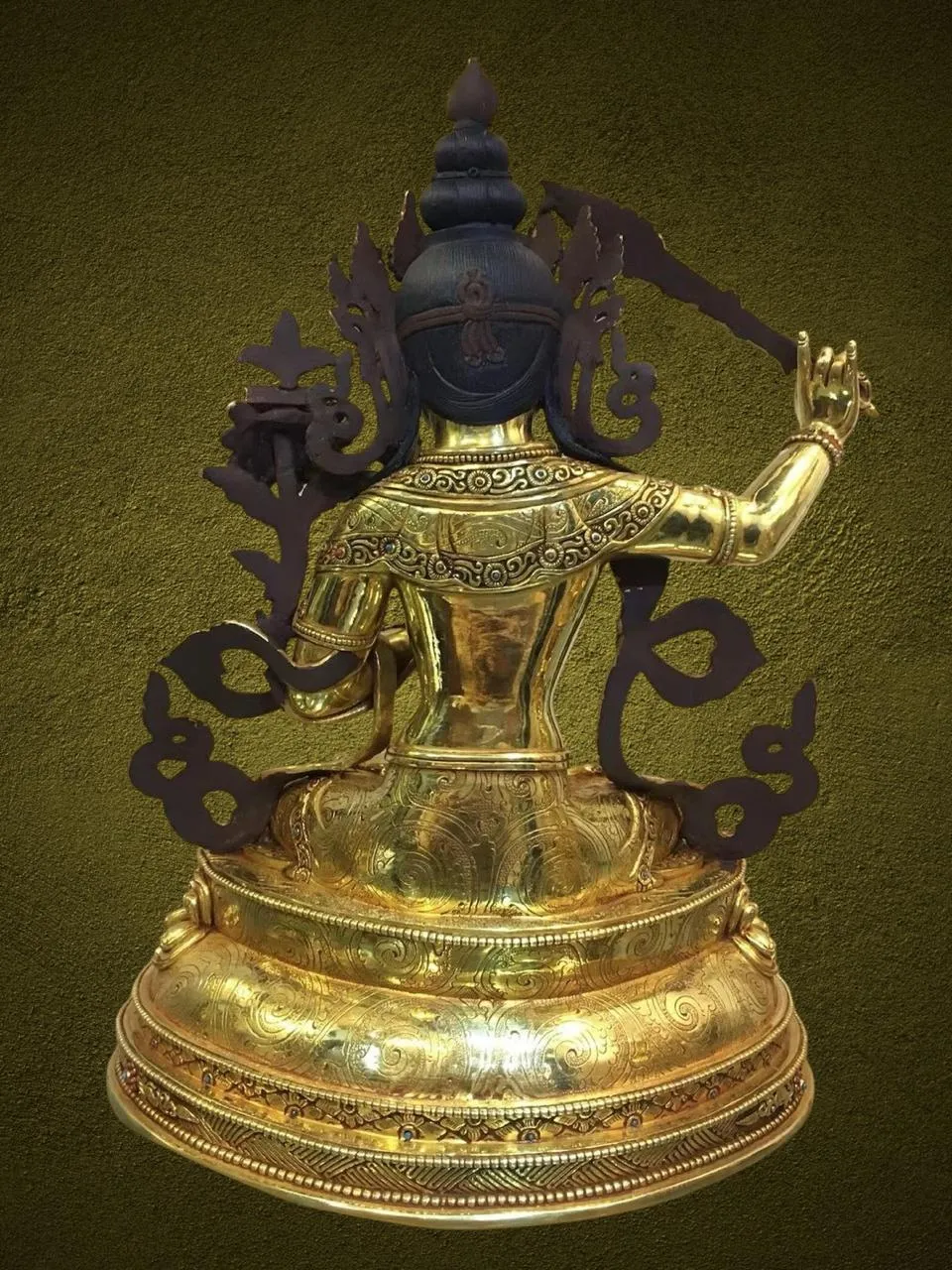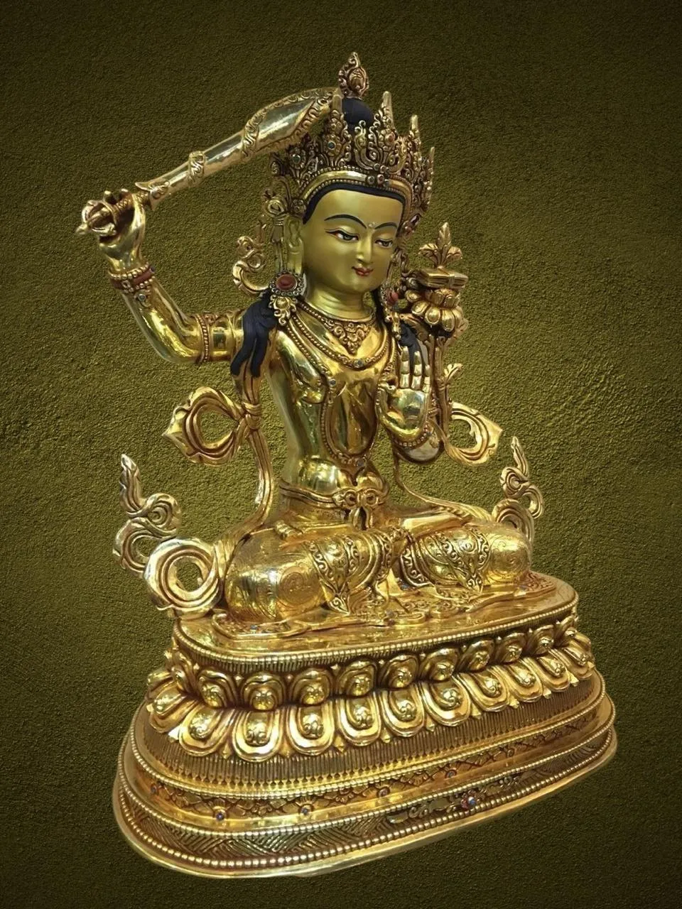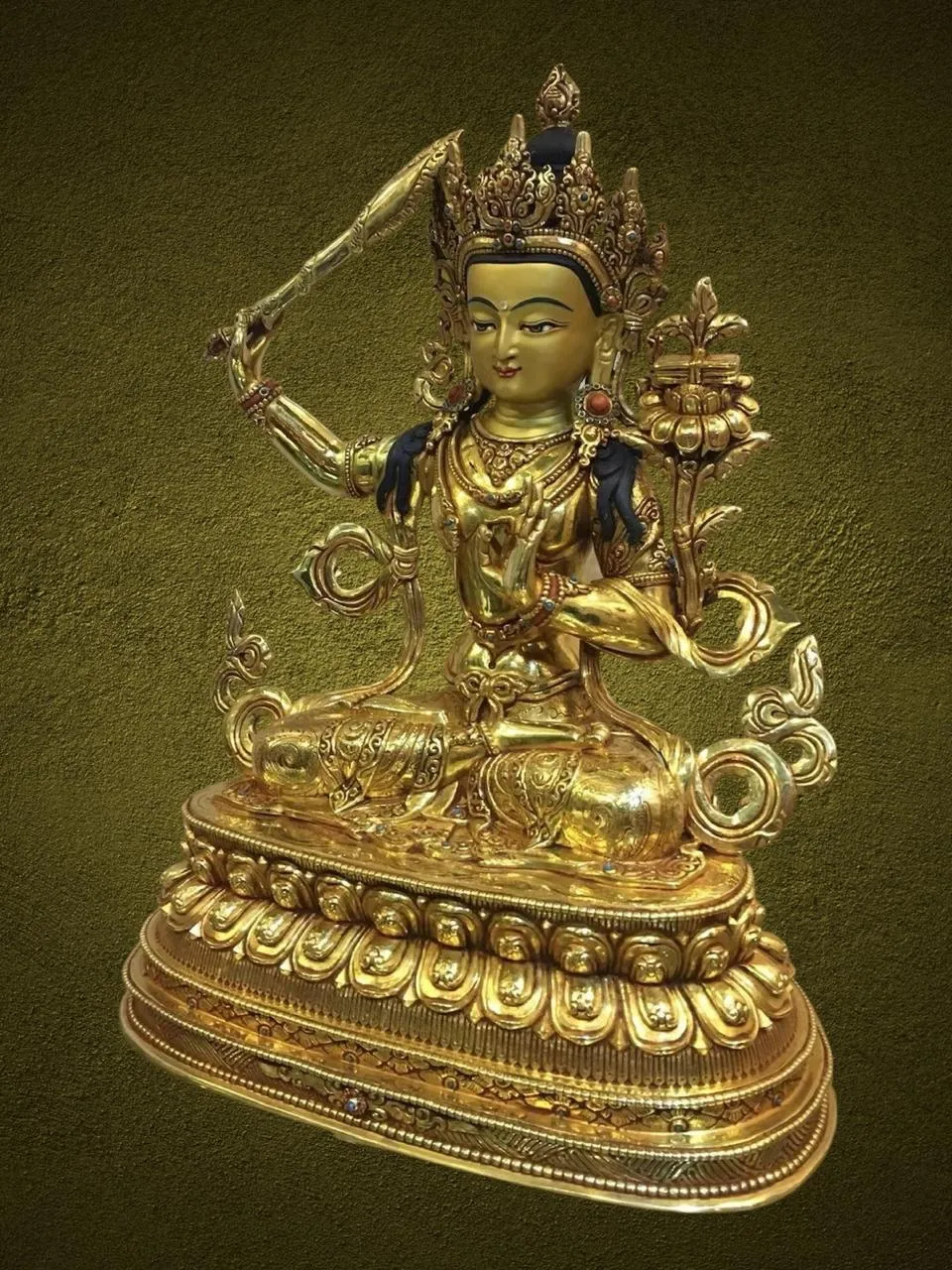 – Manjushree seated with flaming sword raised in right hand, left hand holding scripture on a lotus.