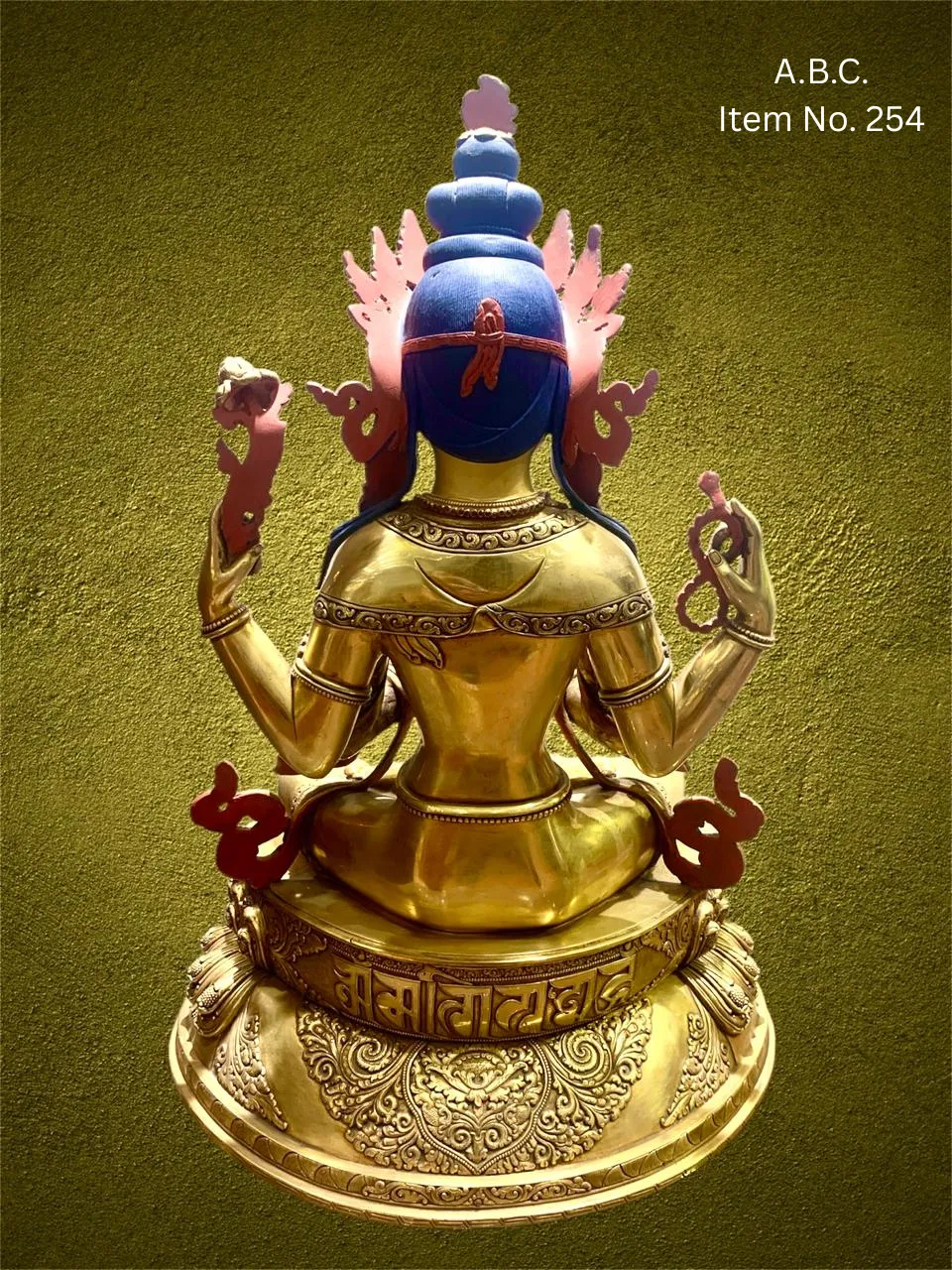 – Chenrezig (Avalokiteshvara) Four-armed figure, holding a lotus, mala, and in prayerful posture.
