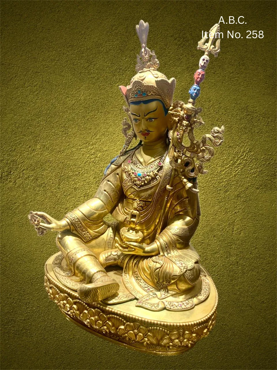 – Guru Rinpoche seated on lotus, right hand holding vajra, left hand with skull-cup and trident behind shoulder.
