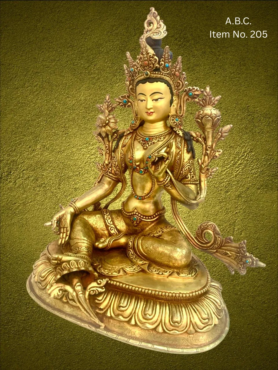 – Green Tara seated in royal ease posture, right hand in blessing mudra, left hand holding a lotus.