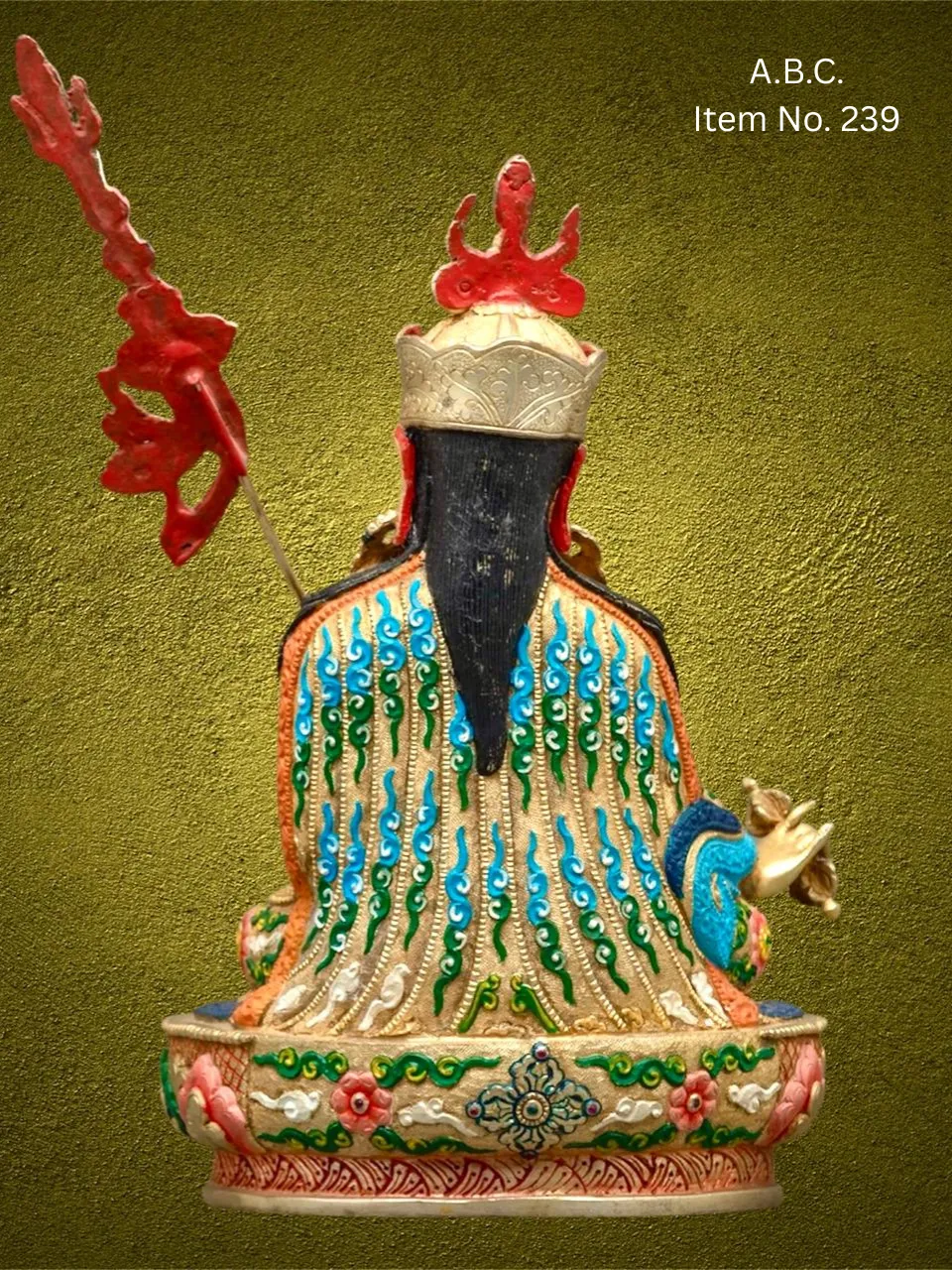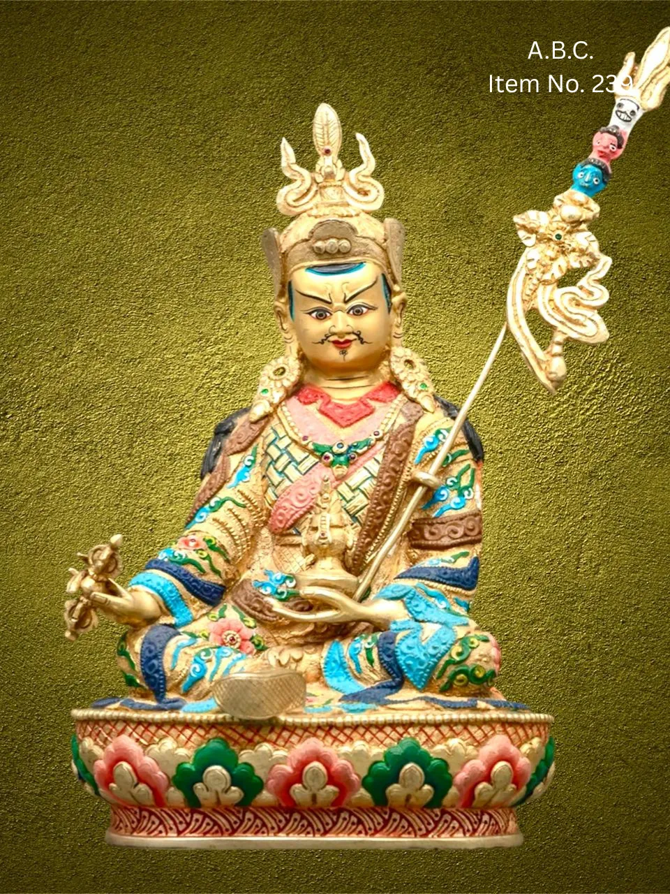 – Guru Rinpoche seated on lotus, right hand holding vajra, left hand with skull-cup and trident behind shoulder.