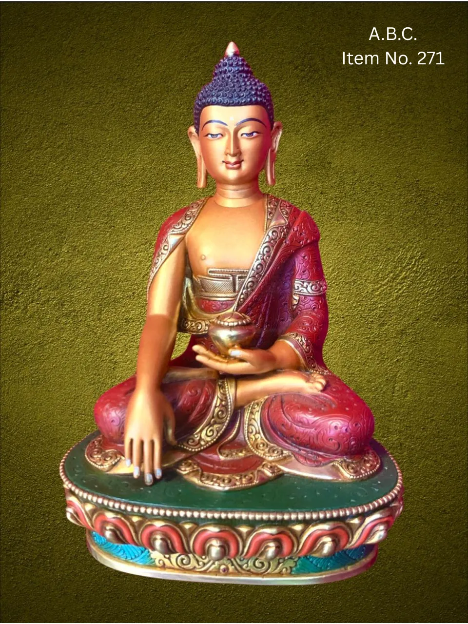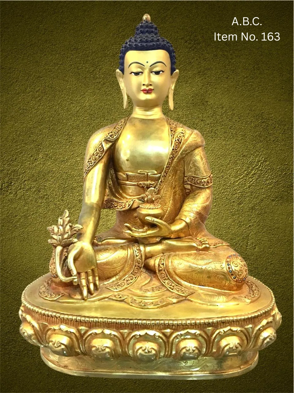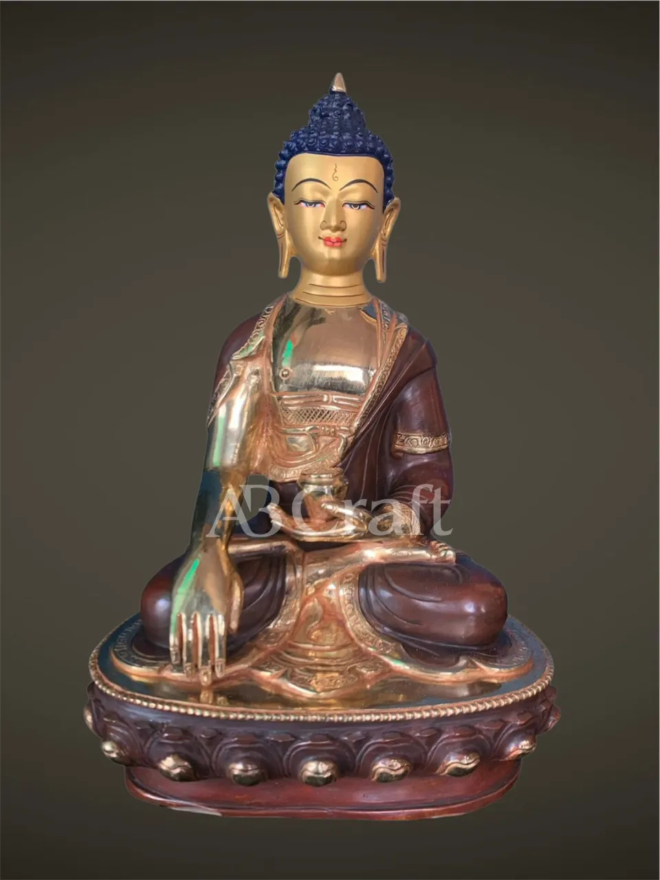 Our Medicine Buddha handicrafts are skillfully handcrafted by master artisans using traditional Himalayan techniques. He is depicted seated in a meditative posture, holding a healing myrobalan plant in his right hand and a bowl of medicinal nectar in his left, signifying the power to heal suffering and eliminate the causes of disease.