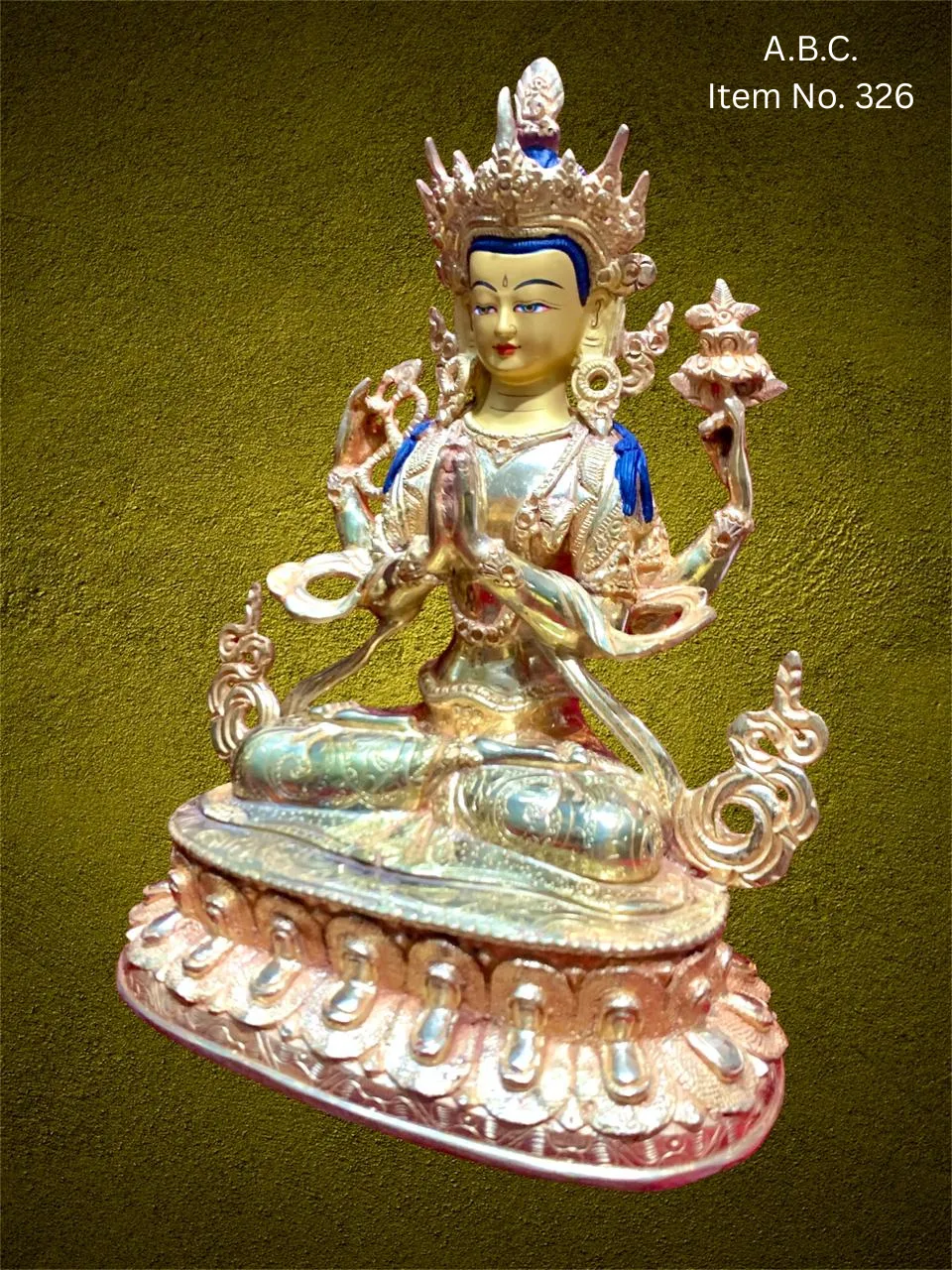 – Chenrezig (Avalokiteshvara) Four-armed figure, holding a lotus, mala, and in prayerful posture.