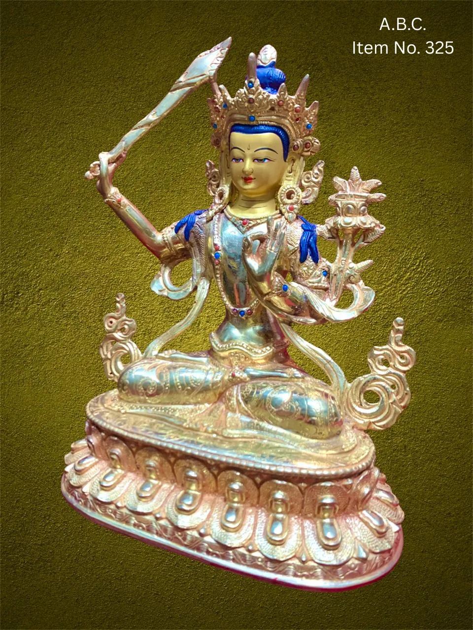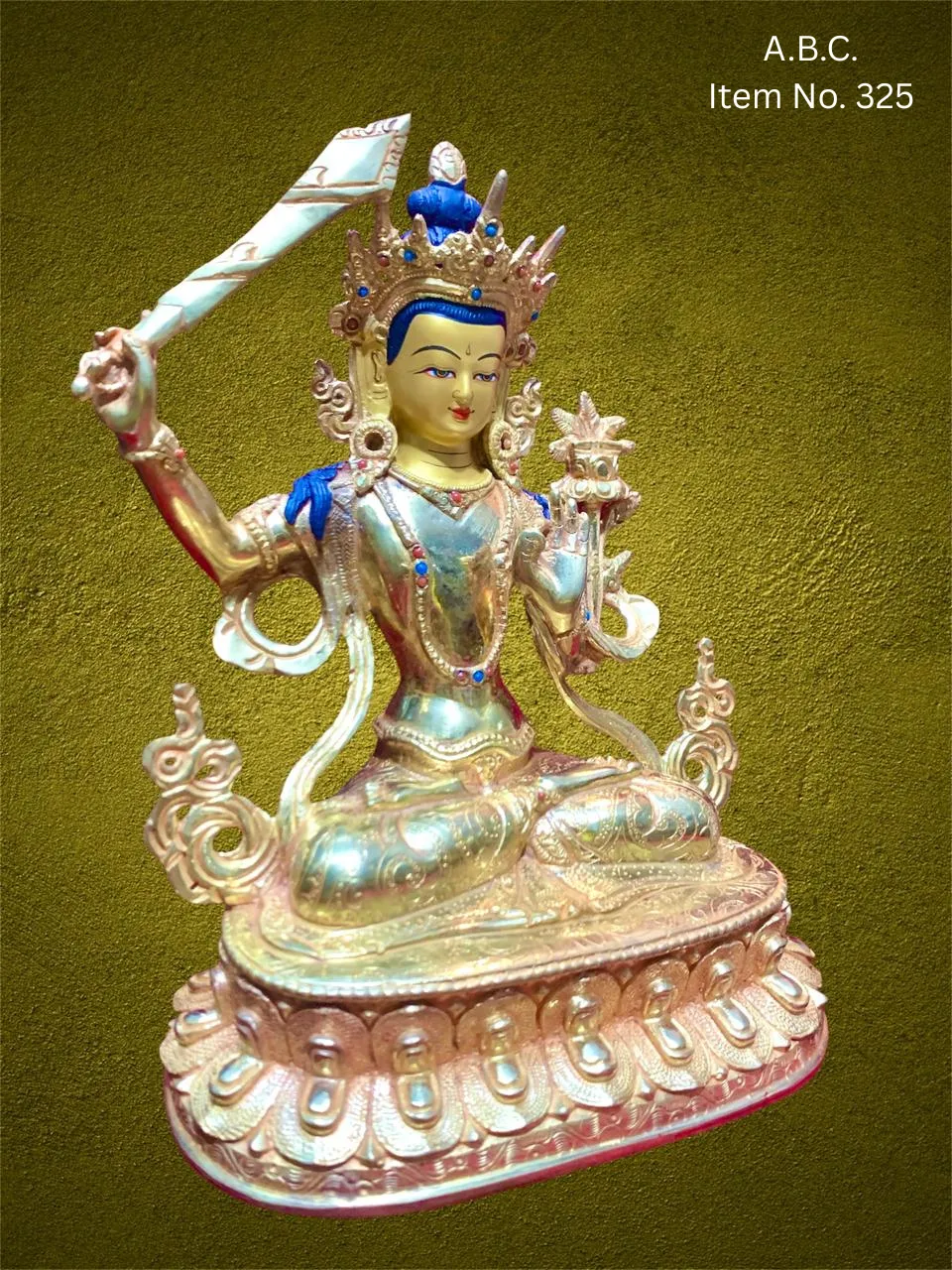 Our Manjushree handicrafts are exquisitely handcrafted by skilled artisans of the Himalayas using materials such as bronze, copper, or silver, often enhanced with gold plating and gemstone inlays like turquoise or coral. Each statue or artwork embodies intricate craftsmanship and spiritual depth, with fine detailing that brings Manjushree's divine presence to life.