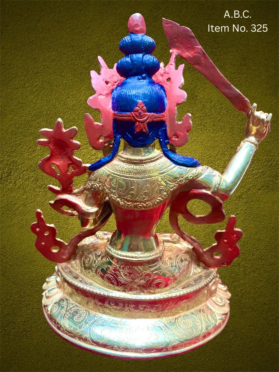 – Manjushree seated with flaming sword raised in right hand, left hand holding scripture on a lotus.