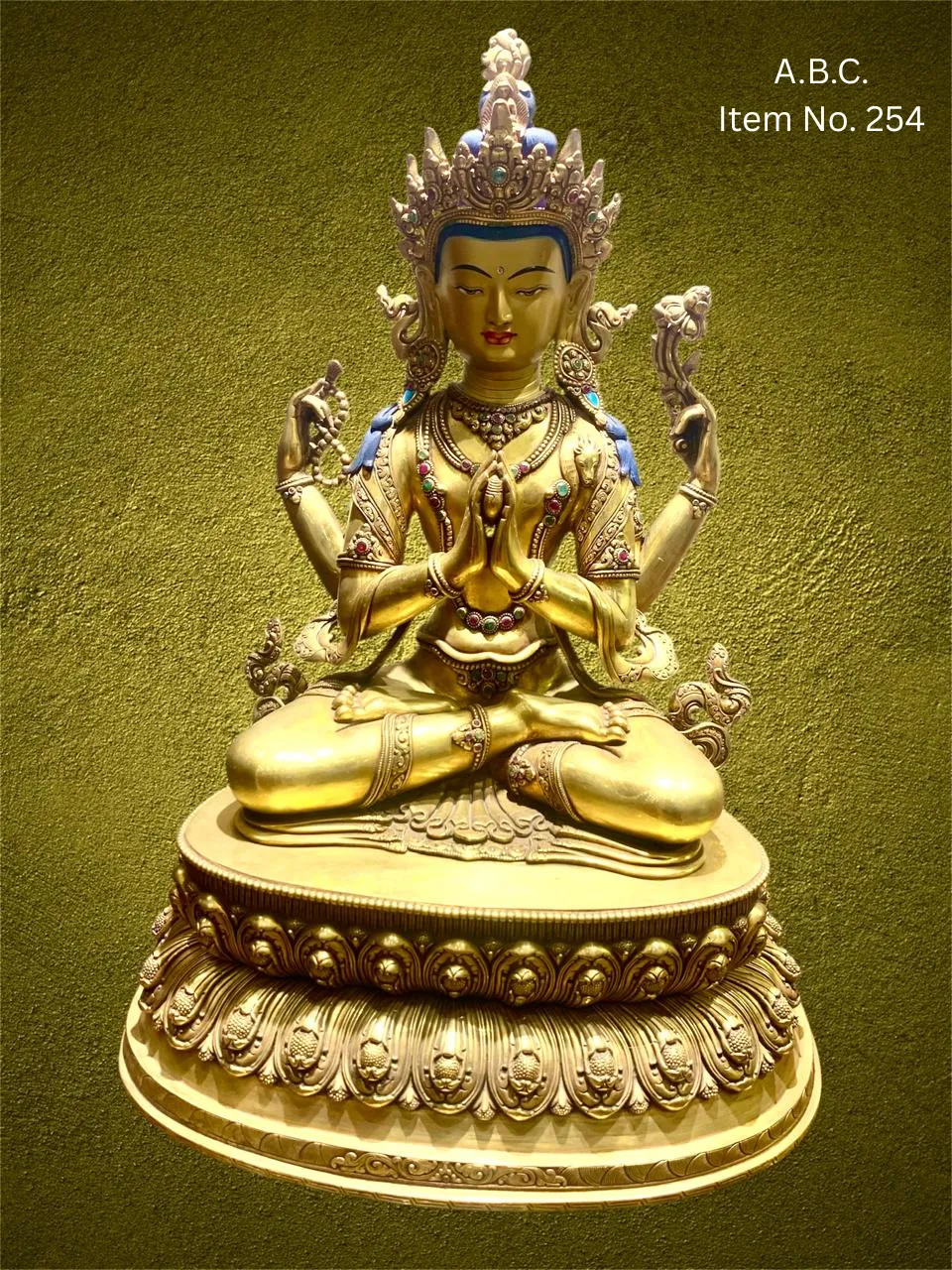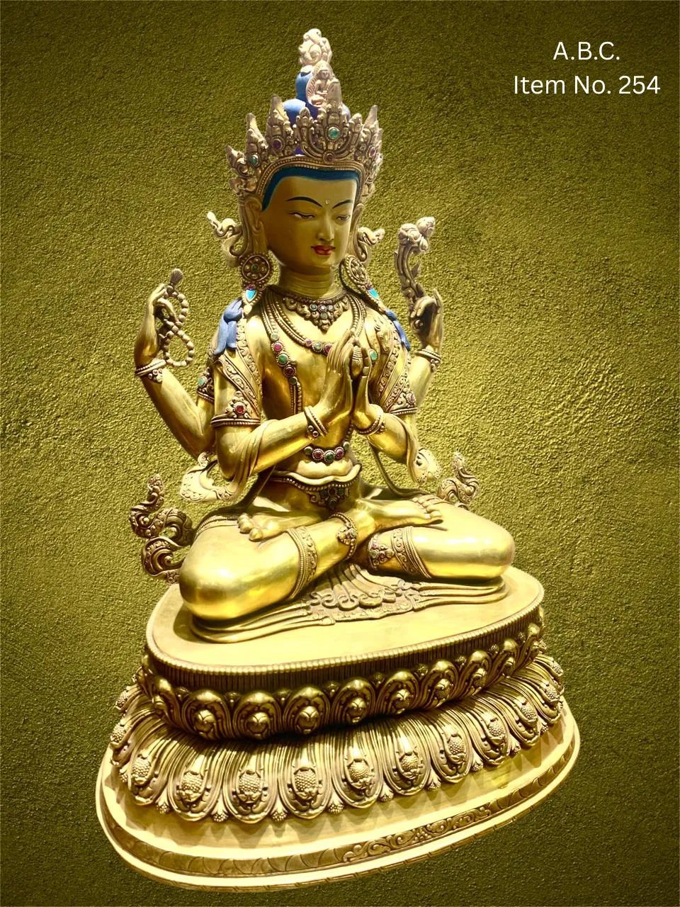 – Chenrezig (Avalokiteshvara) Four-armed figure, holding a lotus, mala, and in prayerful posture.