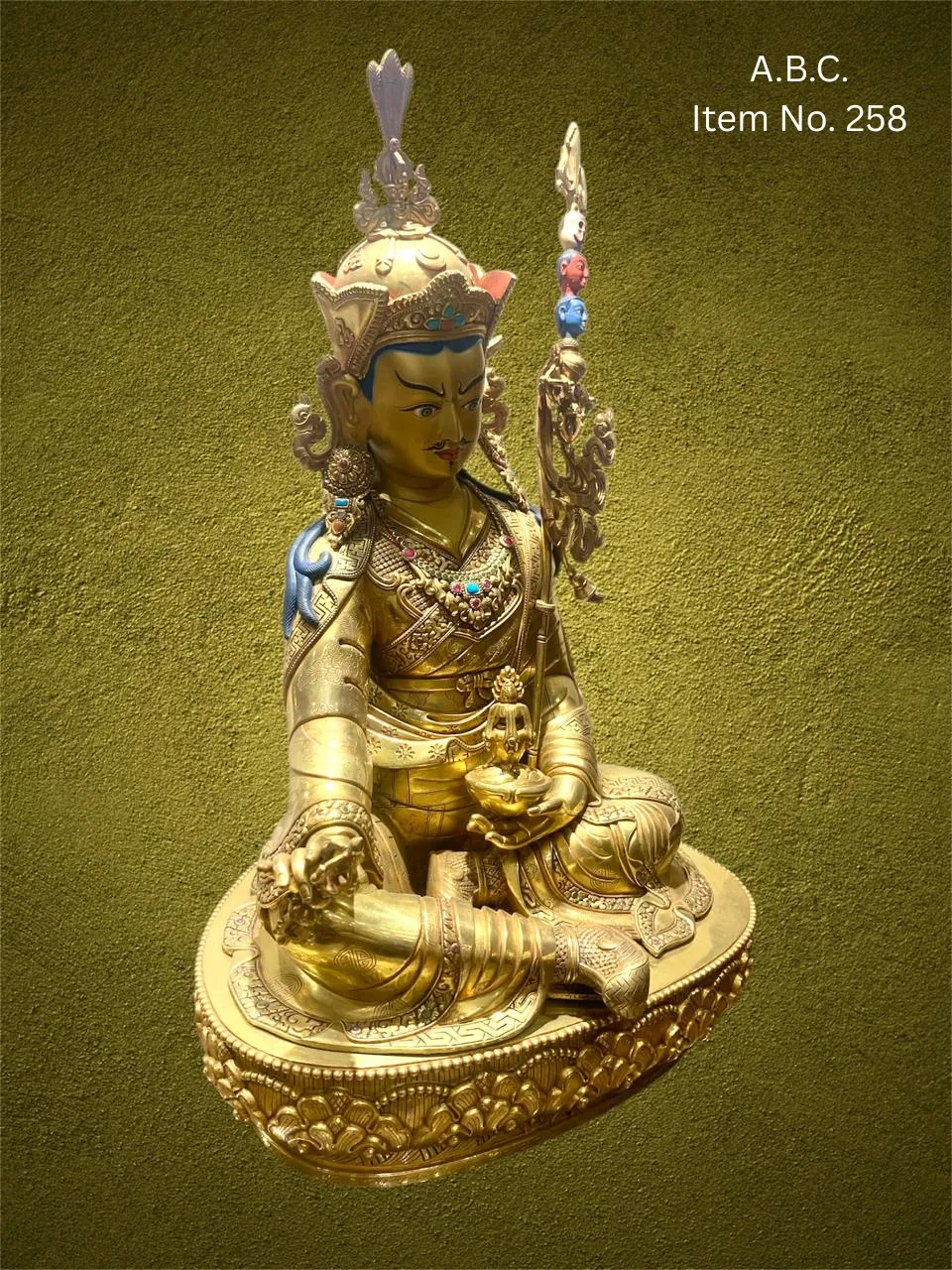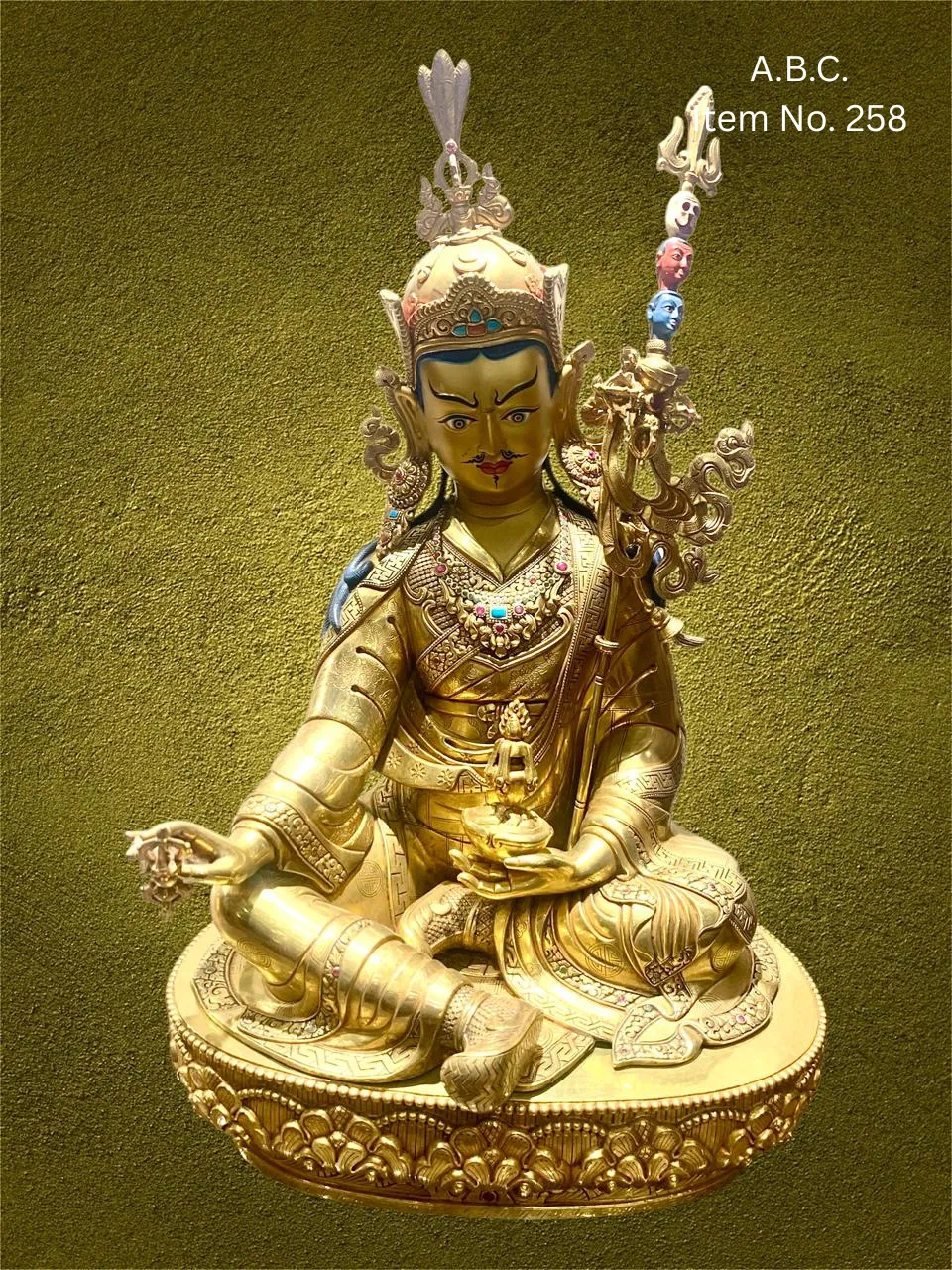 – Guru Rinpoche seated on lotus, right hand holding vajra, left hand with skull-cup and trident behind shoulder.