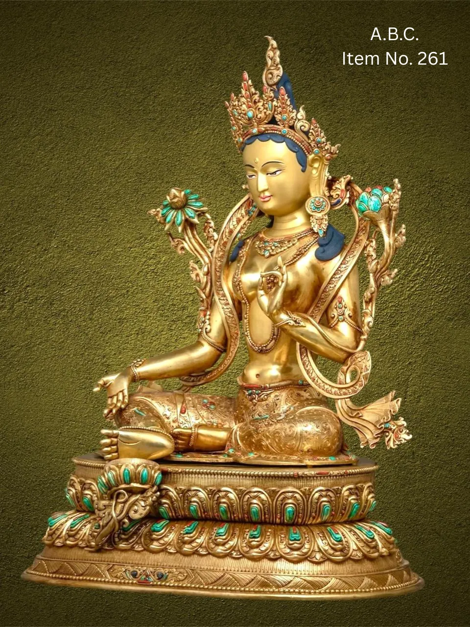 – Green Tara seated in royal ease posture, right hand in blessing mudra, left hand holding a lotus.