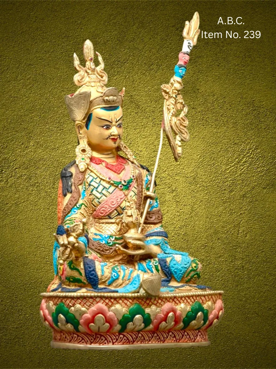 – Guru Rinpoche seated on lotus, right hand holding vajra, left hand with skull-cup and trident behind shoulder.
