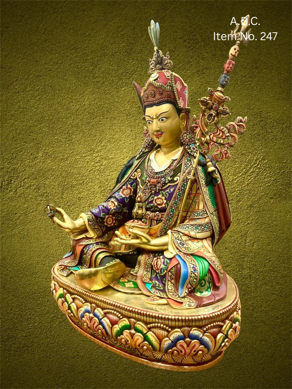 – Guru Rinpoche seated on lotus, right hand holding vajra, left hand with skull-cup and trident behind shoulder.