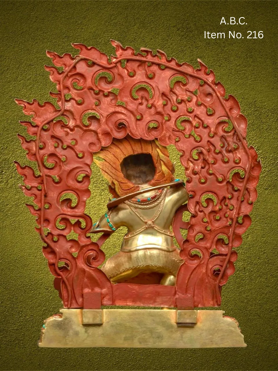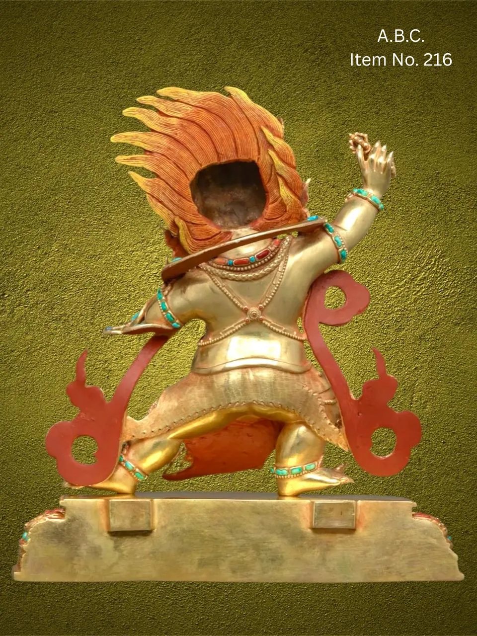 He is typically depicted in a dynamic, wrathful stance, surrounded by flames that symbolize the burning away of delusion. In his right hand, he wields the vajra, symbolizing indestructible power and the force of enlightenment. His muscular form, adorned with serpents and adorned with skulls or jewels, reflects his role as a protector and fierce compassionate guide.
